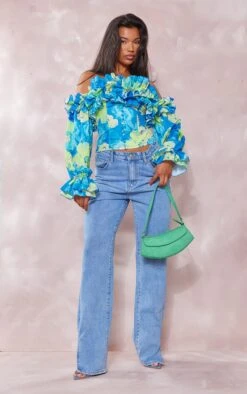 Blouse bleu fleurie volantée à manches longues et épaules dénudées