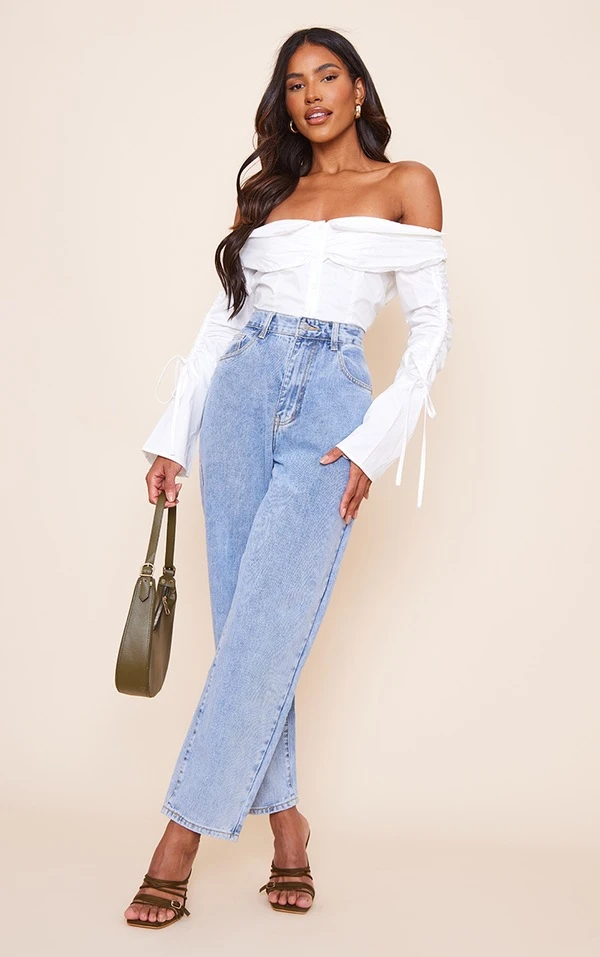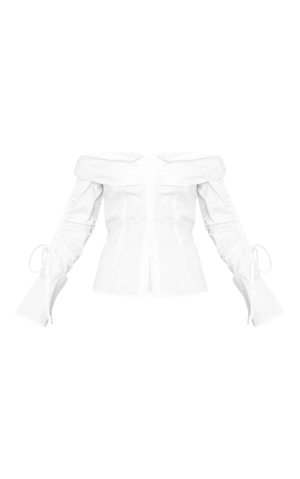 Blouse boutonnée blanche en coton à col bardot et manches froncées