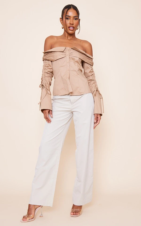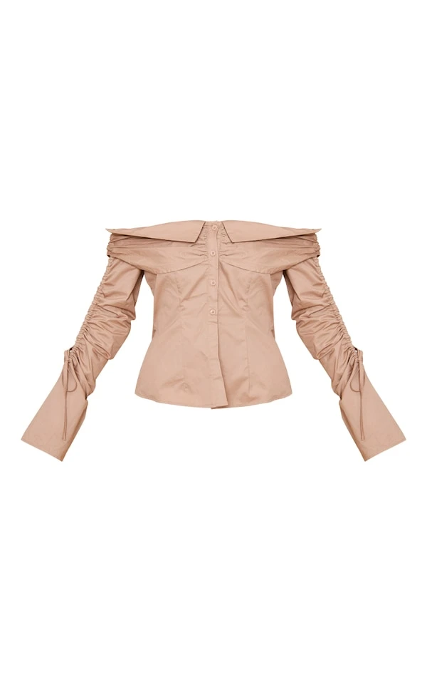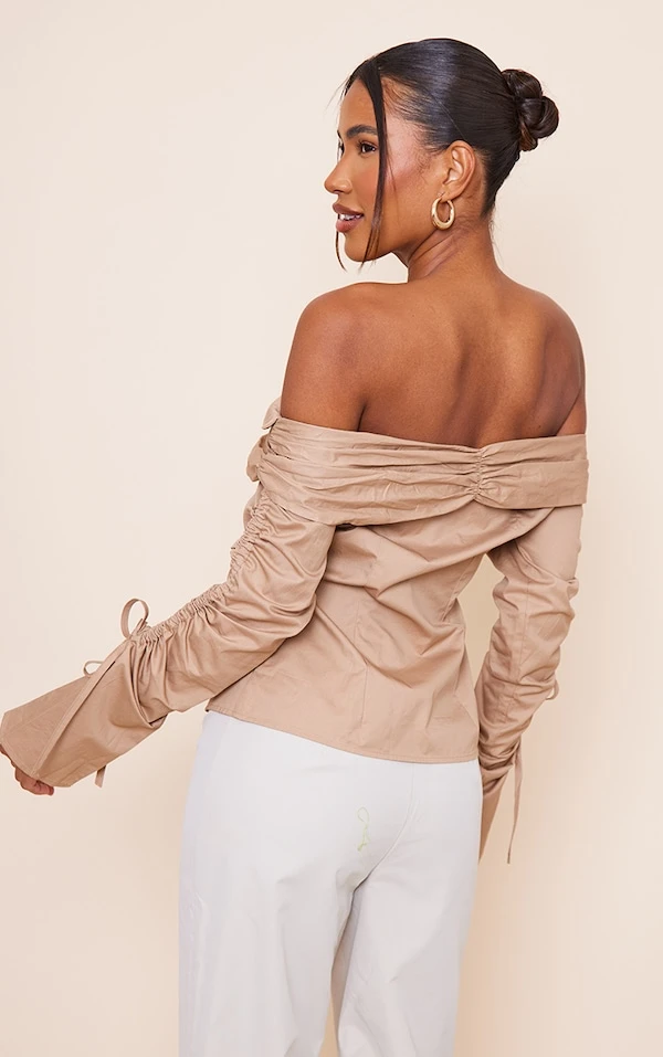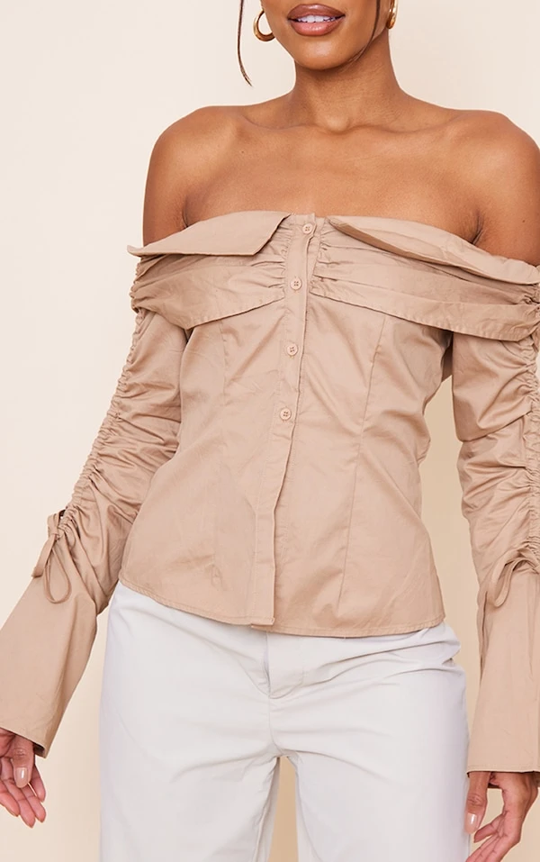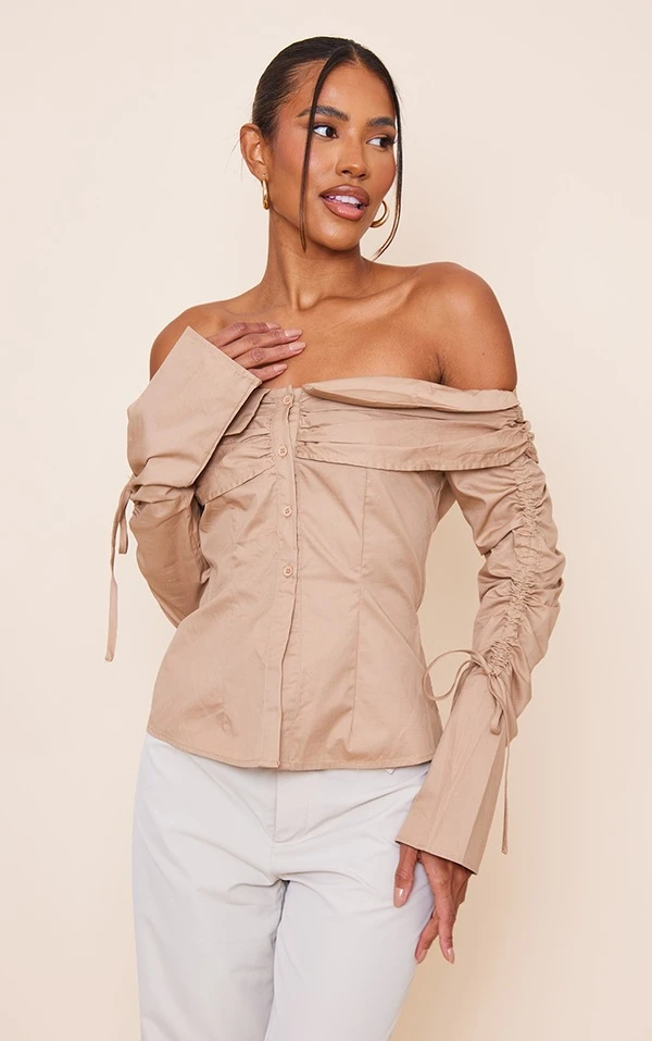 Blouse boutonnée taupe en coton à col bardot et manches froncées