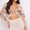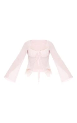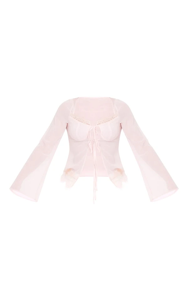 Blouse en mousseline de soie rose pâle nouée devant à bordure en dentelle et manches flare