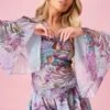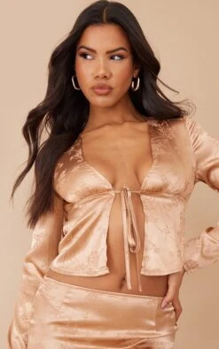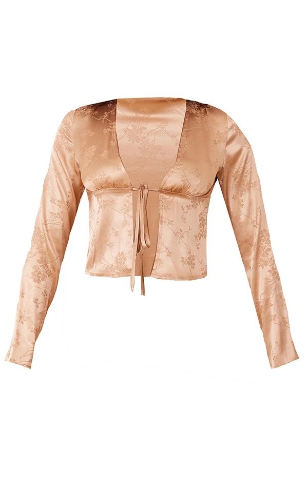 Blouse fleurie café au lait en jacquard satiné à nouer devant