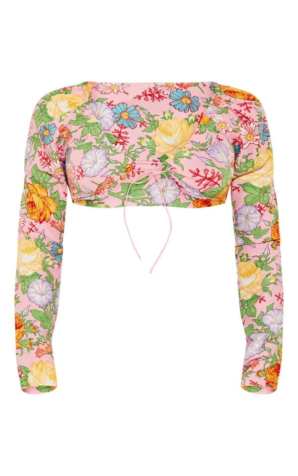 Blouse fleurie rose à manches longues et devant noué