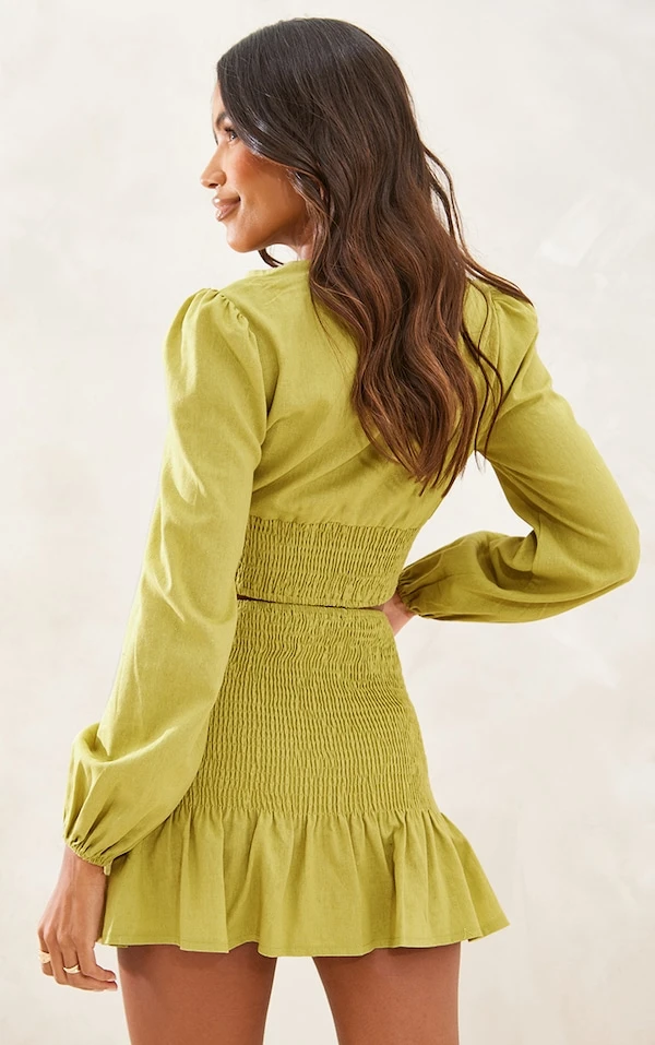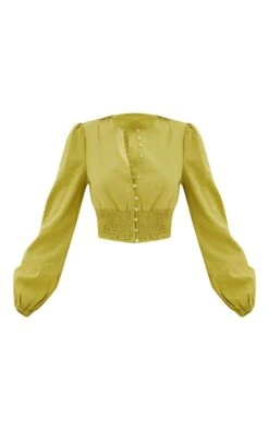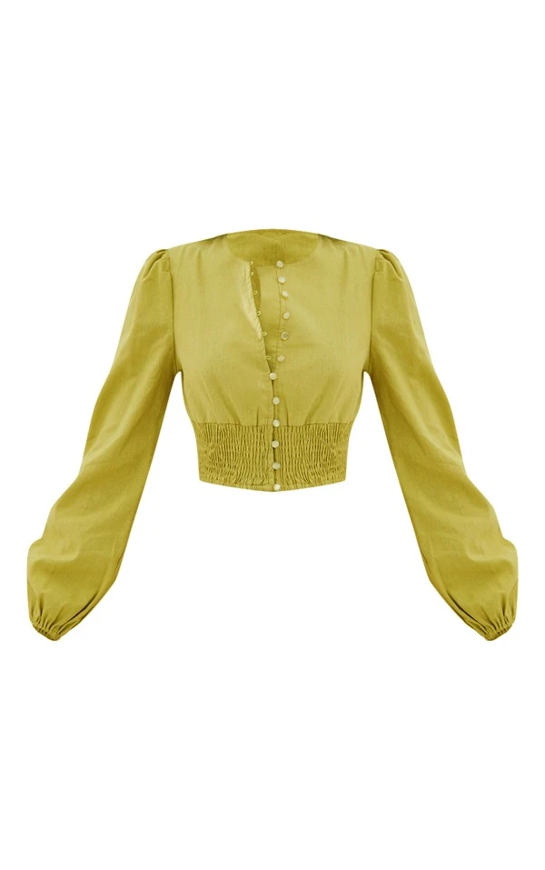 Blouse froncée vert sauge effet lin à boutons et manches ballon