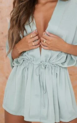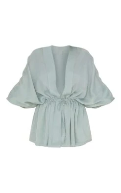 Blouse texturée vert sauge à décolleté tissé et ceinture ajustable