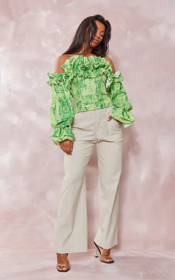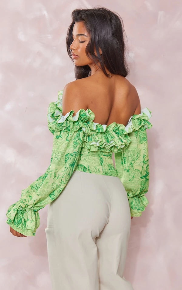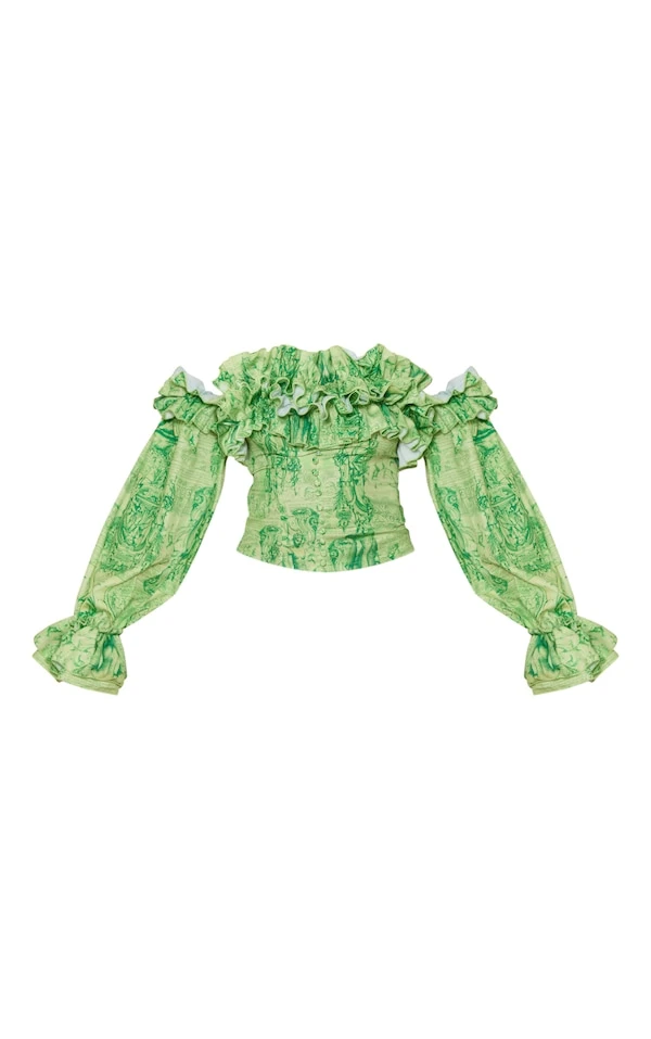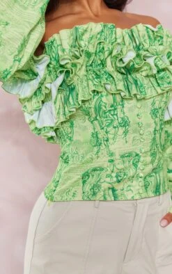 Blouse vert citron imprimé renaissance volantée à manches longues et épaules dénudées