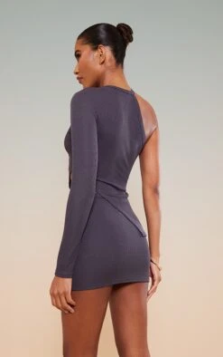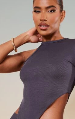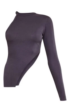 Crop top asymétrique côtelé gris anthracite à col montant