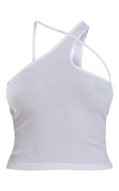 Crop top côtelé doux asymétrique blanc détail bretelle