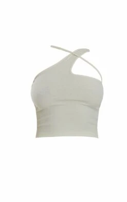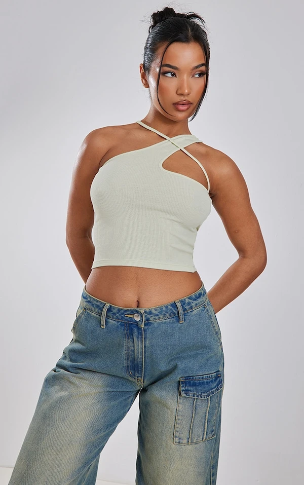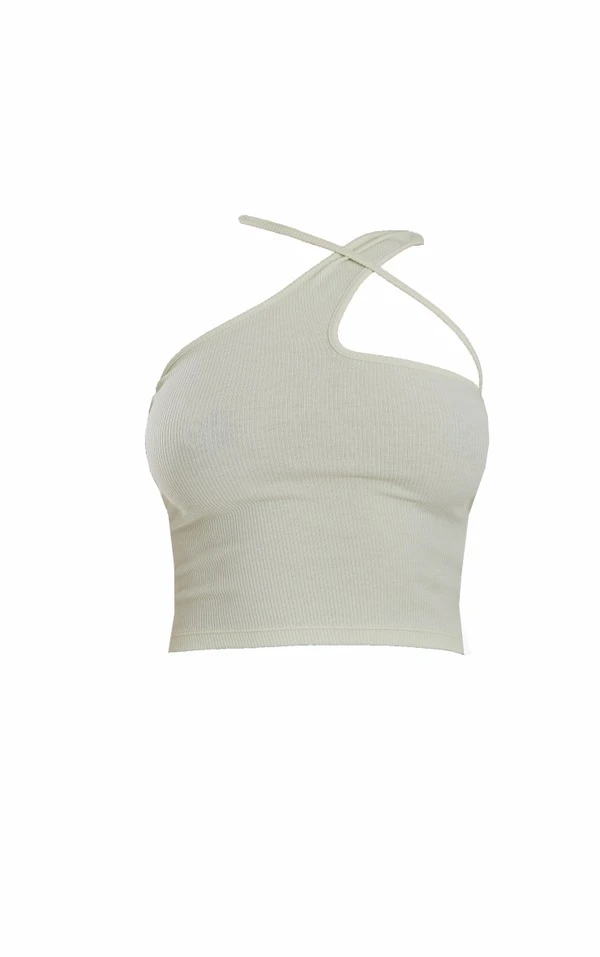 Crop top côtelé doux asymétrique sauge détail bretelle