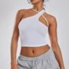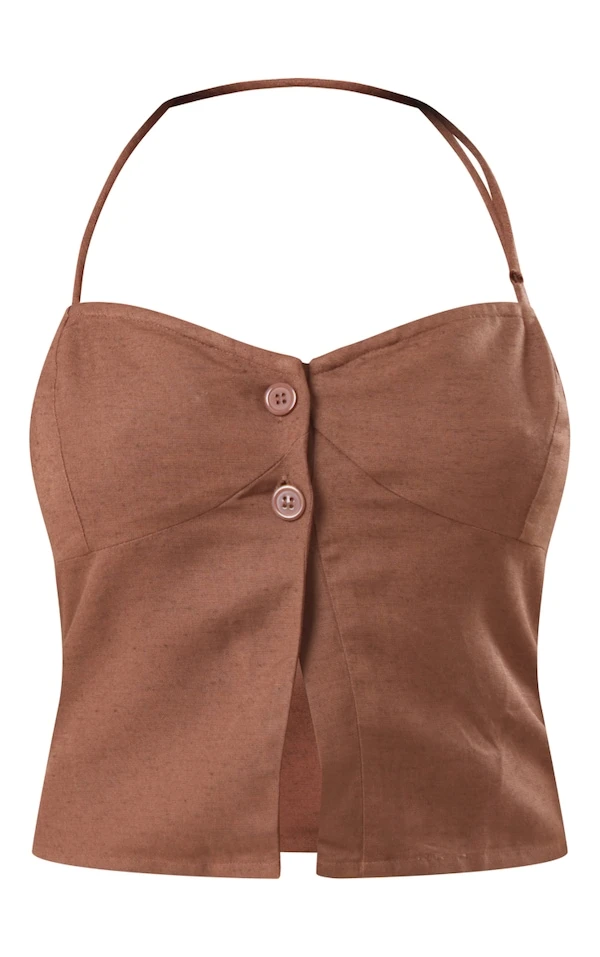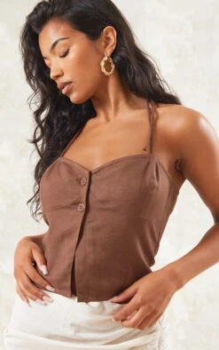 Crop top dos nu chocolat effet lin à bouton noué dans le dos