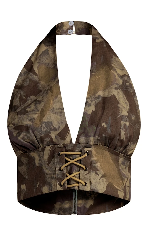 Crop top kaki imprimé camouflage à dos nu et devant lacé