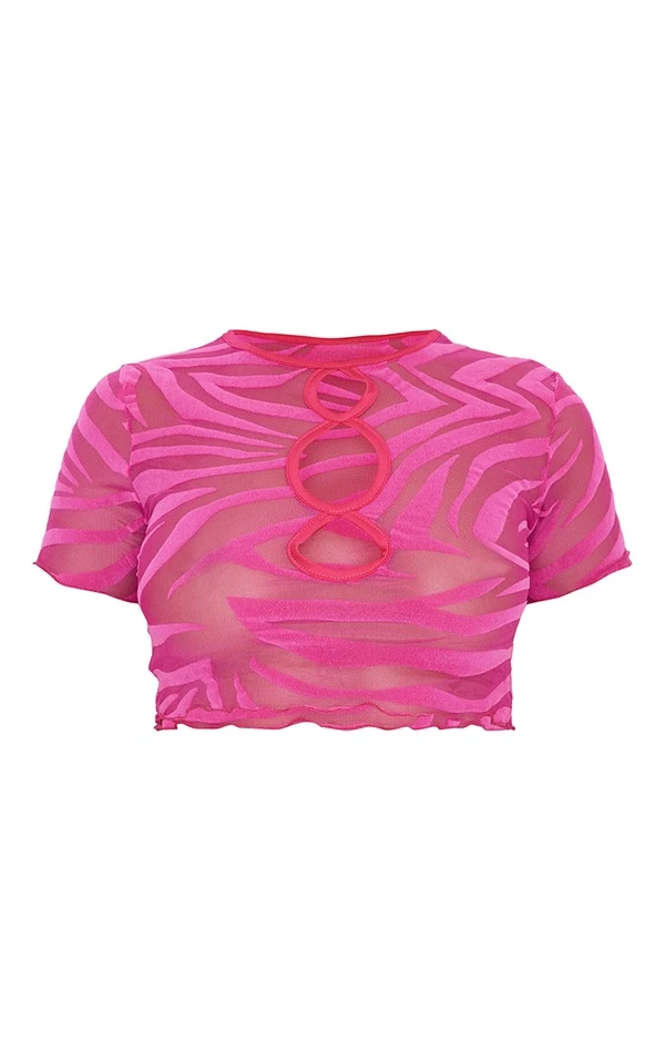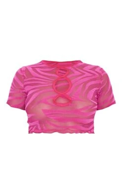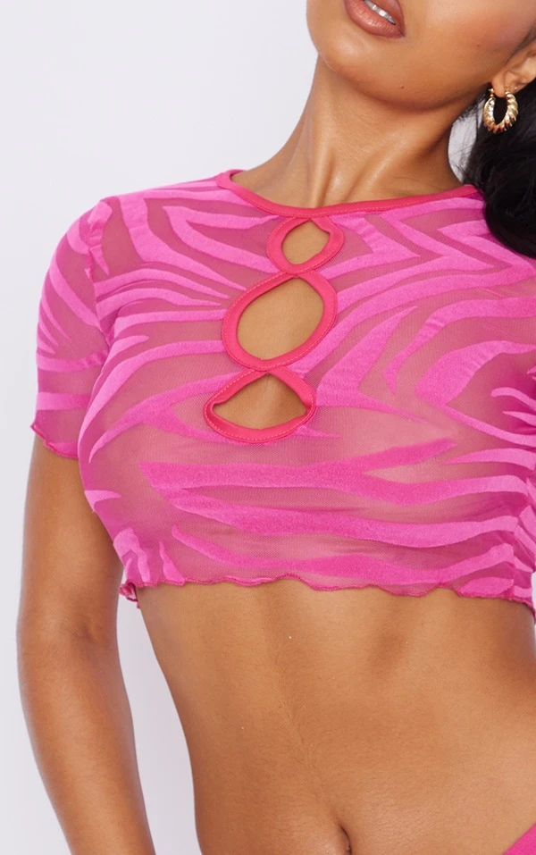 Crop top rose vif imprimé dévoré zébré à manches courtes et devant découpé