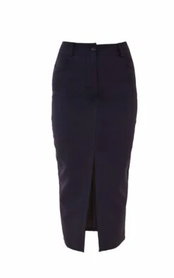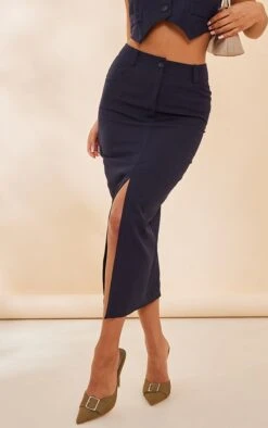 Trop belle, surtout dans cette jupe fendue à la coupe mi-longue. Avec sa couleur bleu marine et sa matière en maille tissée, elle réalise un sans-faute. Portez-le avec le gilet sans manches de la même couleur, des talons et quelques accessoires. Vous savez vous démarquer avec style, vous !