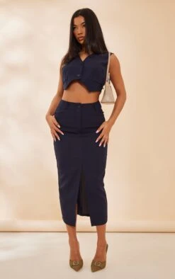 Trop belle, surtout dans cette jupe fendue à la coupe mi-longue. Avec sa couleur bleu marine et sa matière en maille tissée, elle réalise un sans-faute. Portez-le avec le gilet sans manches de la même couleur, des talons et quelques accessoires. Vous savez vous démarquer avec style, vous !