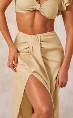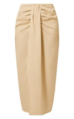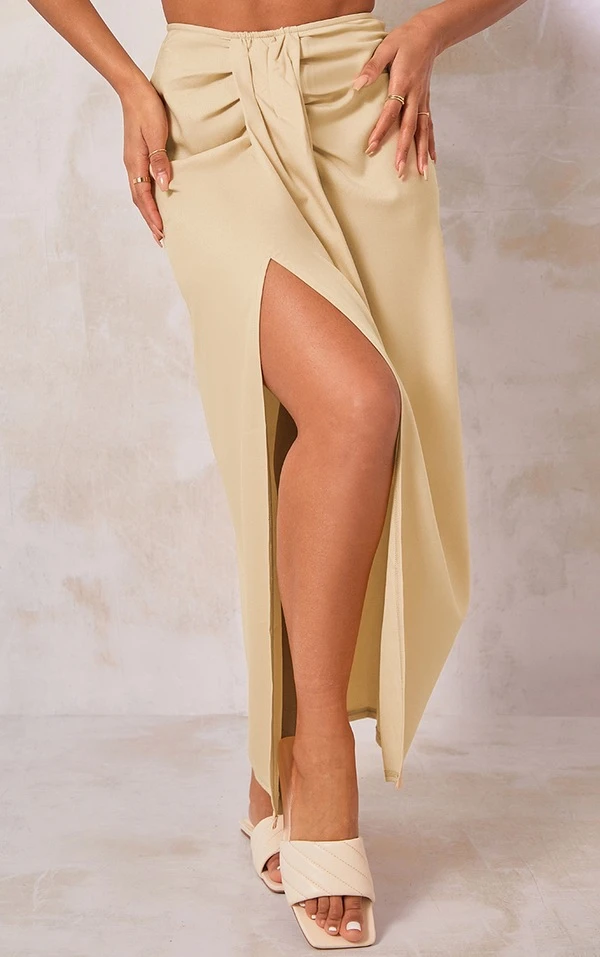 Jupe longue portefeuille en maille tissée gris pierre à devant plissé