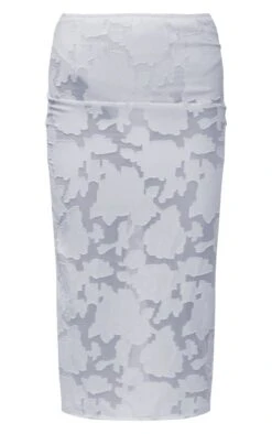 Jupe mi-longue bleu pâle à fleurs en applique à taille haute