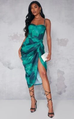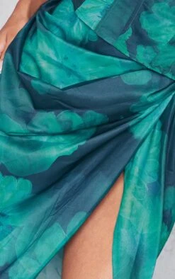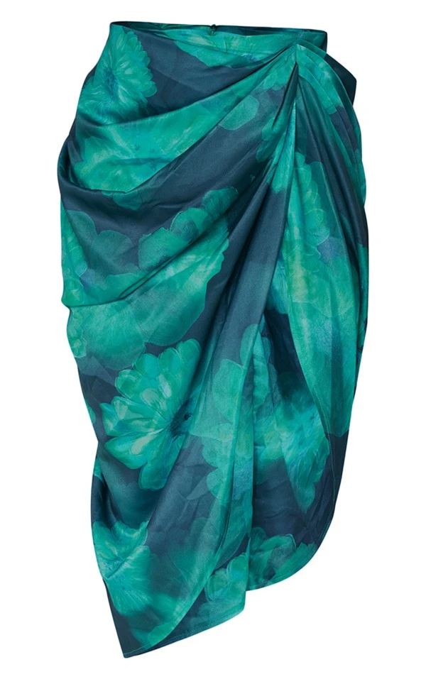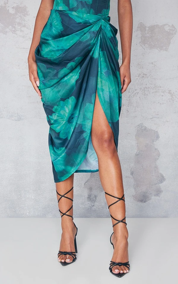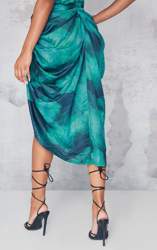Jupe mi-longue bleu sarcelle fleurie à côtés froncés