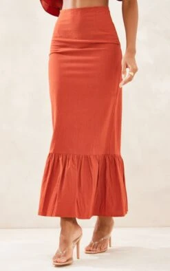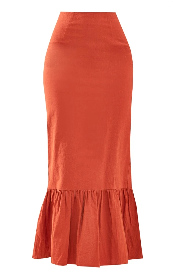 Jupe mi-longue effet lin orange brûlé à taille haute et ourlet fendu
