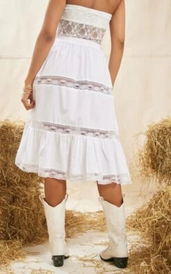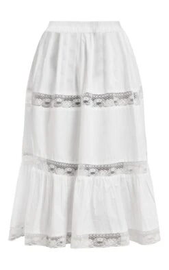 Jupe mi-longue en coton blanc à taille élastique et parties en dentelle