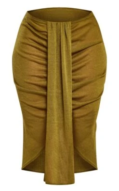 Jupe mi-longue en jersey texturé kaki froncée drapée devant