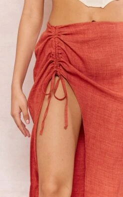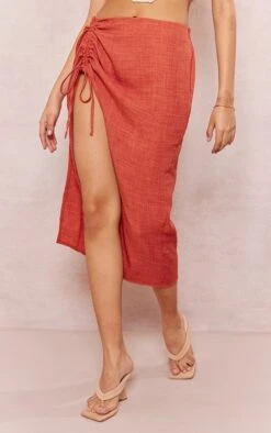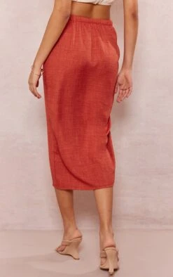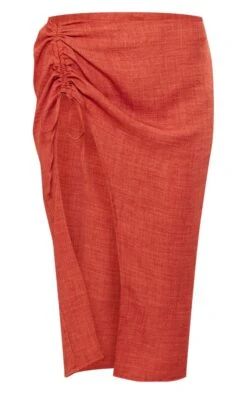 Jupe mi-longue en maille tissée chinée rouille à côté froncé
