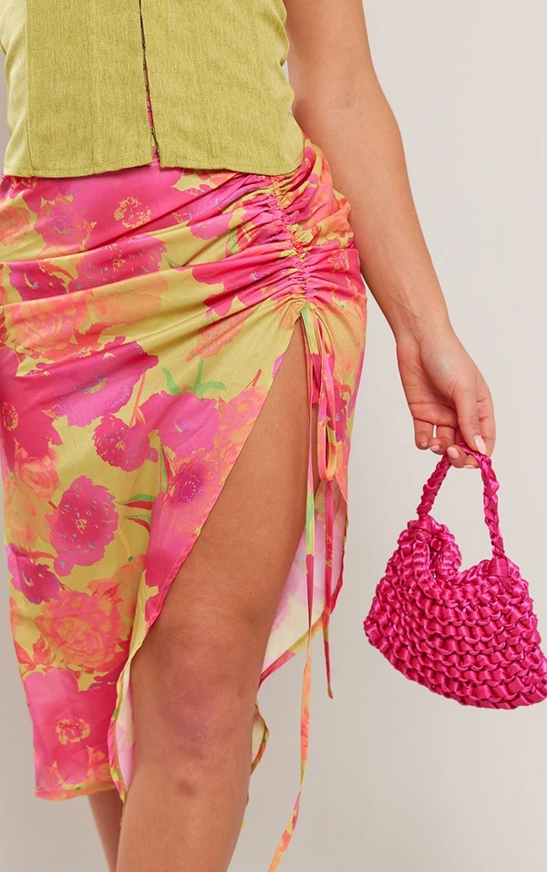 Jupe mi-longue en maille tissée rose à imprimé fleuri flouté et détail froncé