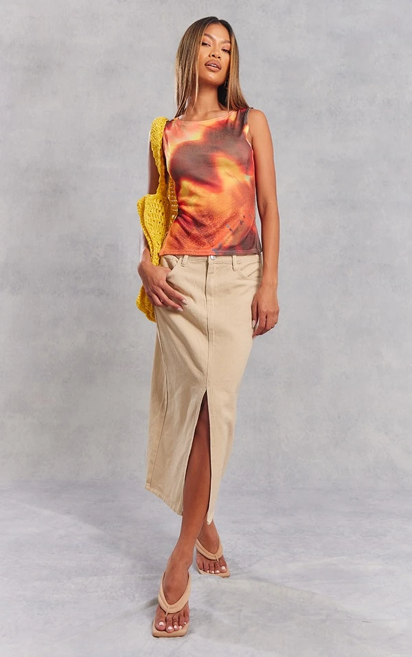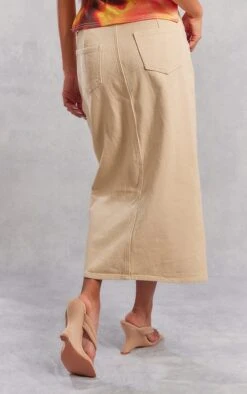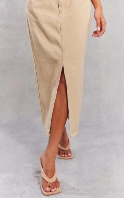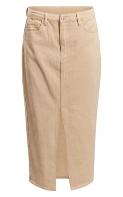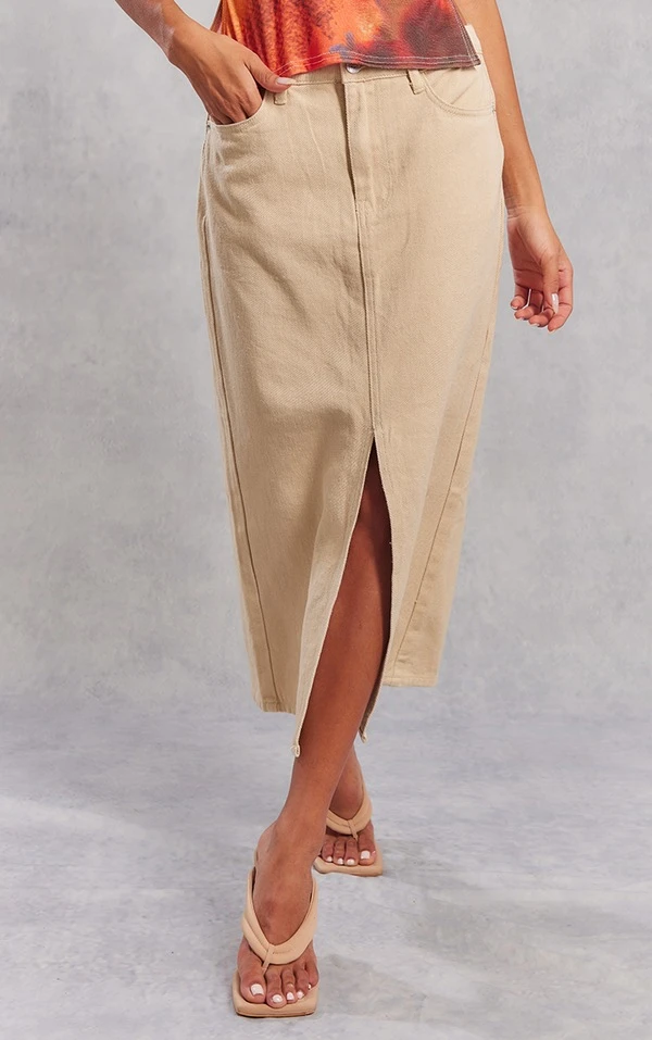 Jupe mi-longue fendue en jean délavé gris pierre à taille mi-haute