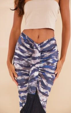 Jupe mi-longue marron à imprimé tigre et ourlet frangé