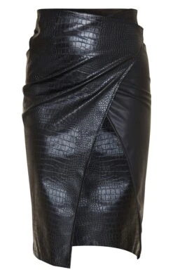 Jupe mi-longue portefeuille en similicuir effet croco noir