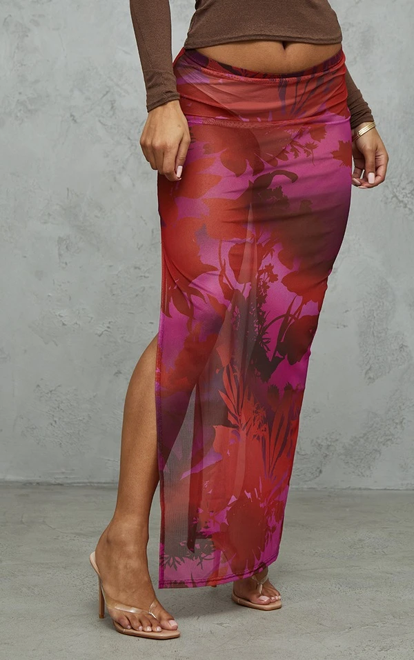 Jupe mi-longue rouge cerise fleurie en mesh fendue