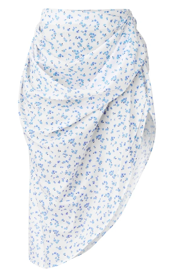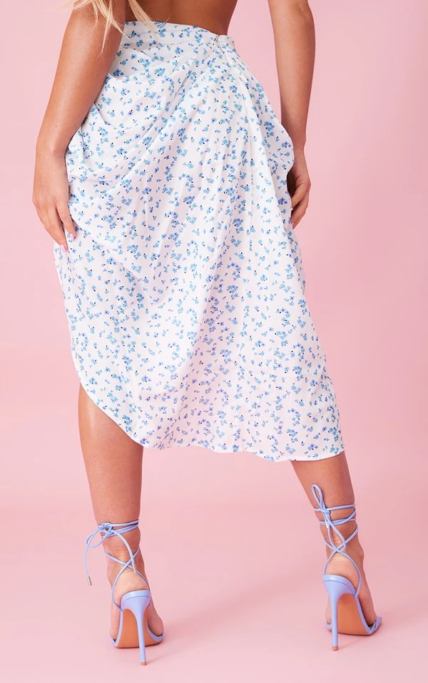 Jupe mi-longue satinée bleue imprimé cachemire à côté froncé