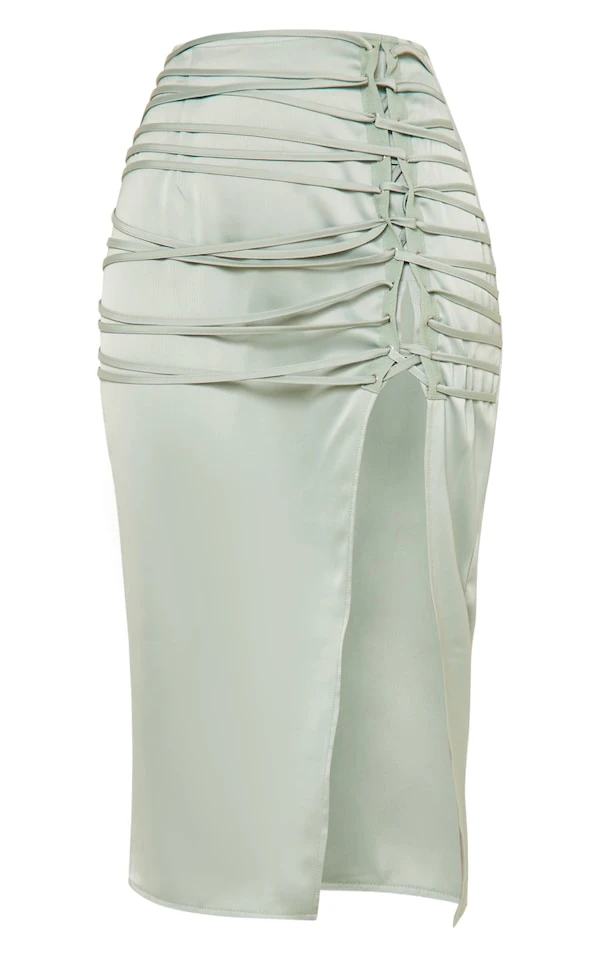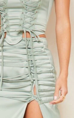 Jupe mi-longue satinée vert sauge kaki à lacets
