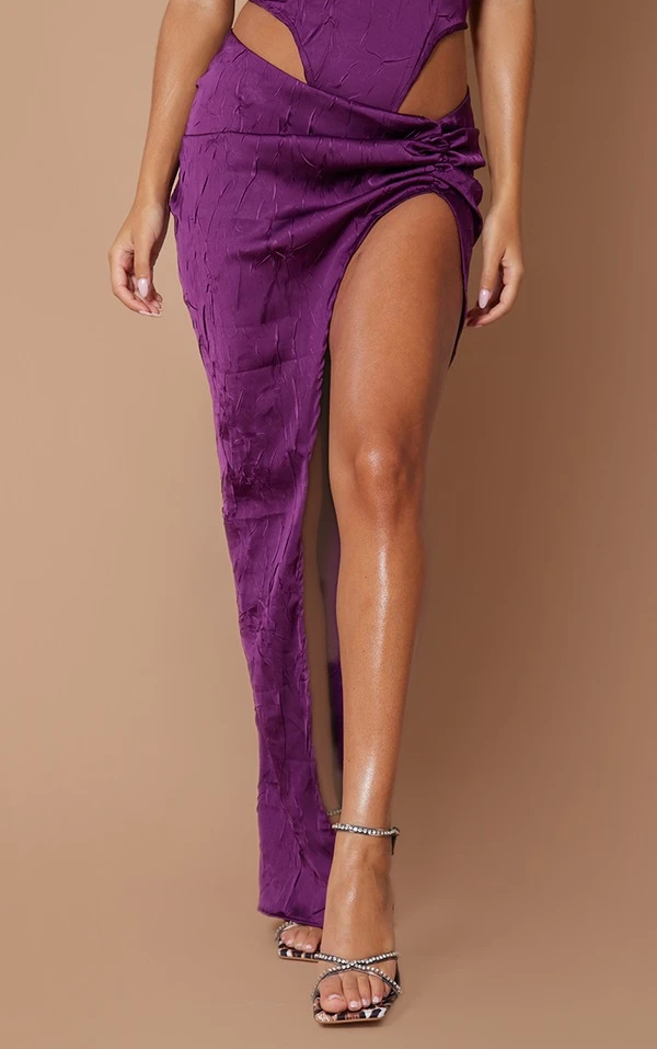 Jupe mi-longue satinée violette à côté froncé