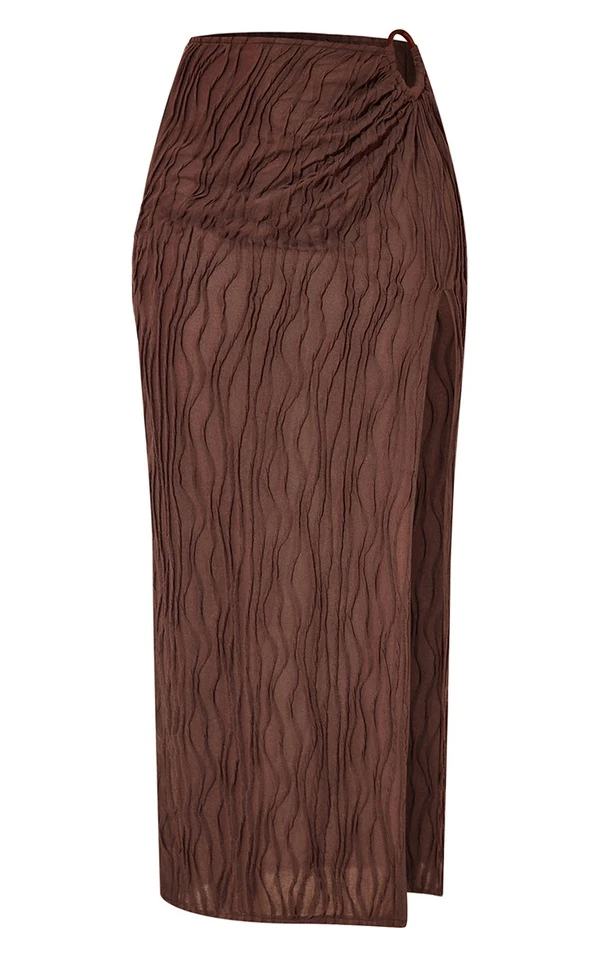 Jolie jupe recherche jolie babe ! Avec sa coupe mi-longue, sa matière texturée stylée et son petit anneau sur la hanche, c’est le crush absolu. On finalise ce look très summer avec des mules à talon et une bralette. Femme fatale, look impeccable !
