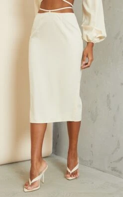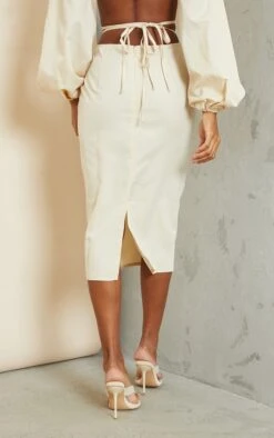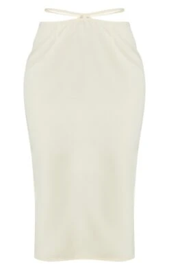 Trop belle la jupe à la coupe mi-longue. On adore sa matière tissée, son coloris crème tout doux et son style ultra cool. En plus son design à nouer sur la taille structure le look tout simplement. On enfile le top assorti et une paire de talons hauts. Vous êtes si belle.