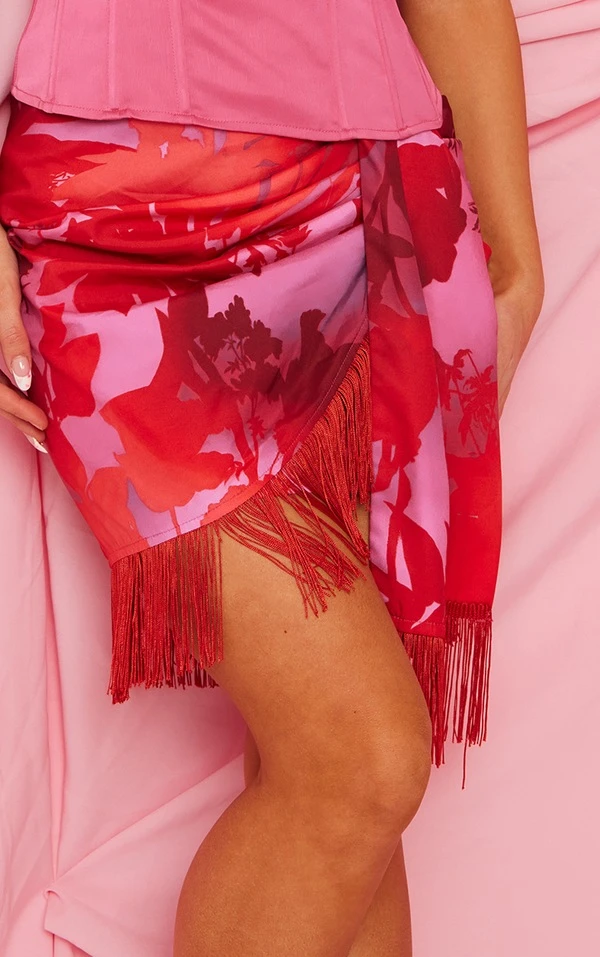 En bombe avec jupe portefeuille ! On aime trop son coloris rouge romantique et son design à imprimé marbe et à franges. Portée avec un top bustier et des talons, le look est 100% validé. What a babe !