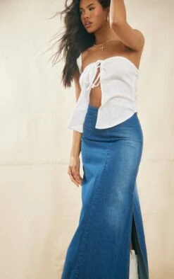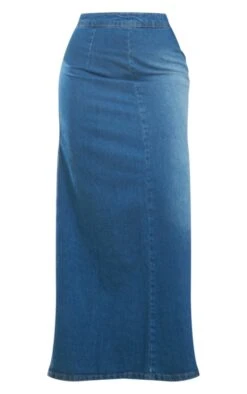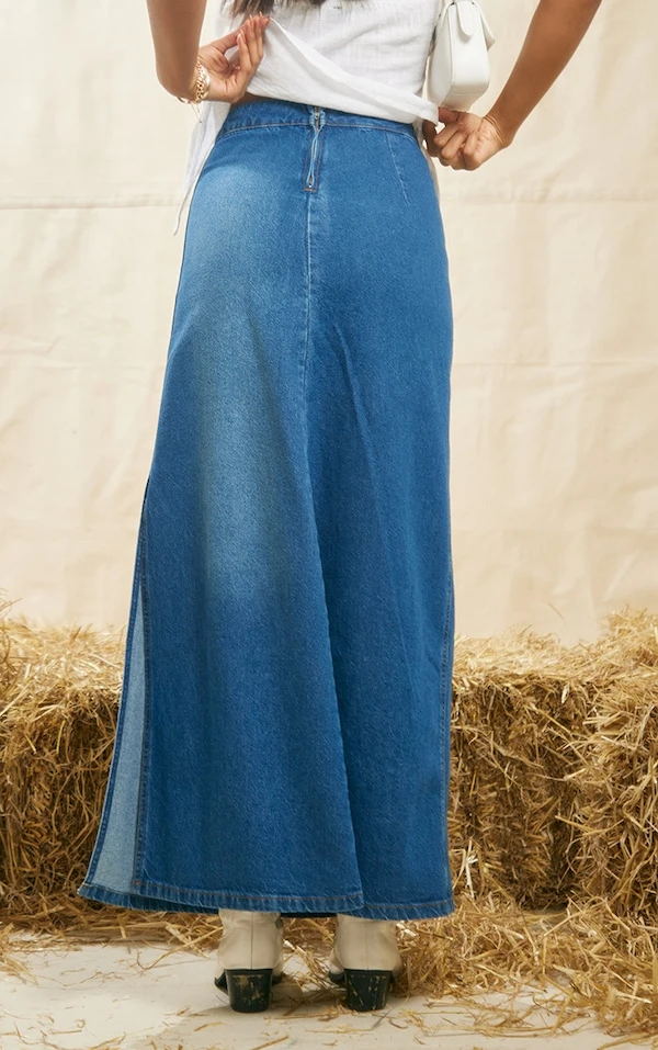 Jupe trapèze longue en jean moyennement délavé bleu