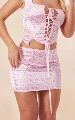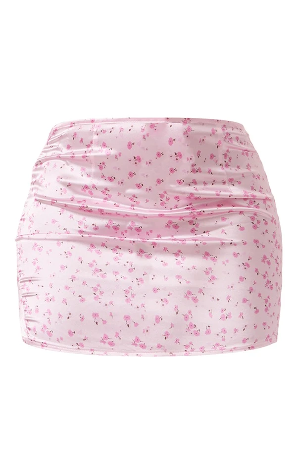 Micro-jupe satinée rose clair à petites fleurs