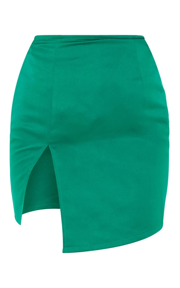 Mini-jupe de tailleur asymétrique satinée vert vif fendue devant