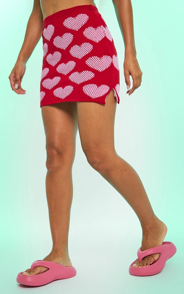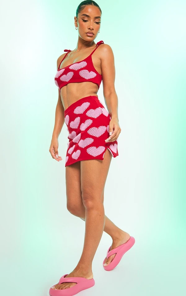 Complètement in love de cette jupe à la coupe mini ! On adore sa maille tricot flatteuse, son coloris rouge et son imprimé à coeurs hyper romantique. Elle est absolument magnifique. On enfile le top assorti et une paire de mules pour rejoindre son date.