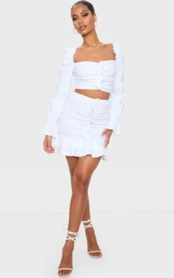 Mini-jupe froncée blanche en maille tissée stretch à volants
