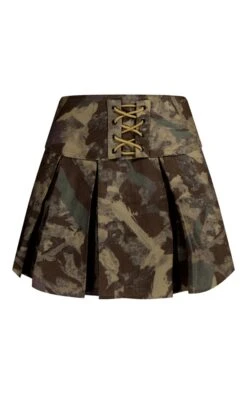 Mini jupe plissée imprimé camouflage kaki à taille basse