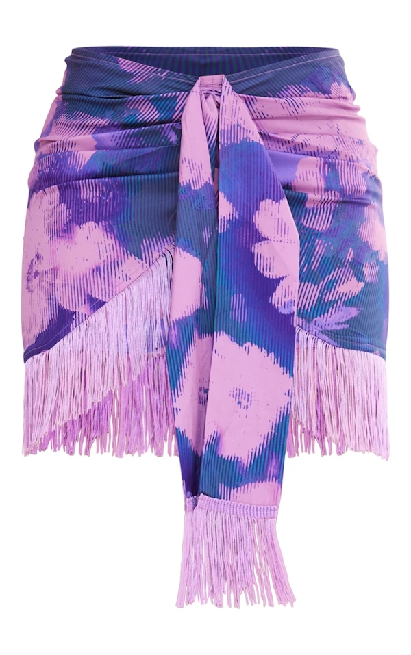 Mini-jupe violette à imprimé fleuri et ourlet à franges