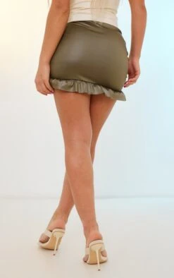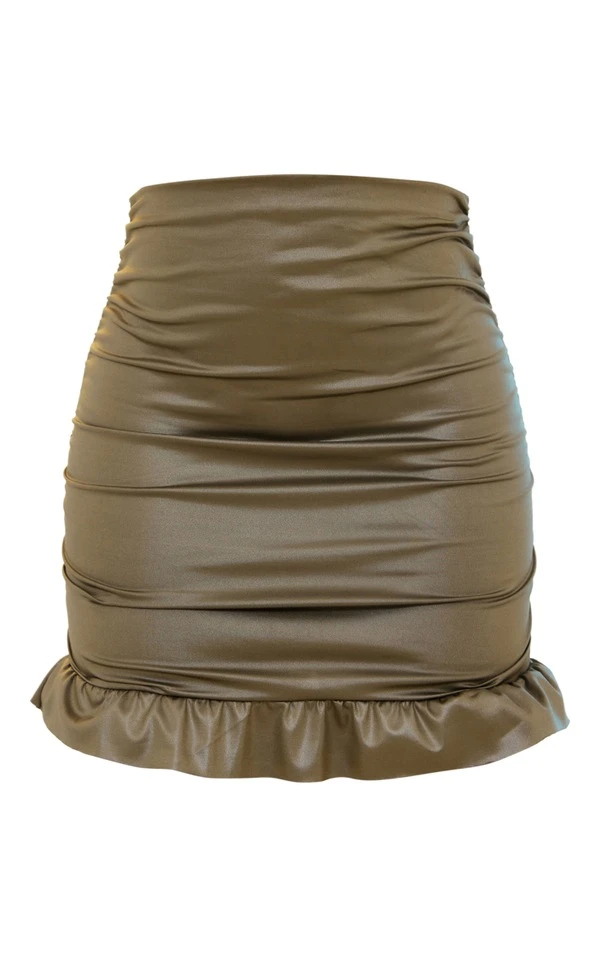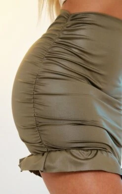 Mini-jupe volantée kaki foncé effet mouillé froncée sur le côté