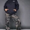 Pantalon Cargo Large Ceinturé Anthracite Imprimé Camouflage à Taille Haute