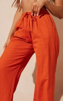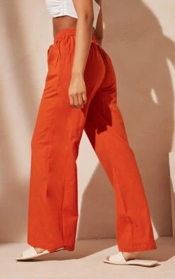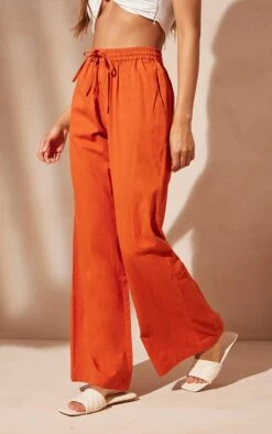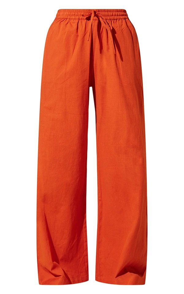 Sublime & stylé, ce pantalon ! Avec son effet lin très léger, sa couleur rouille canon et sa taille élastique, il est très très cool & chic. On le porte avec un crop top blanc et des sandales. Summer vibes !