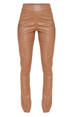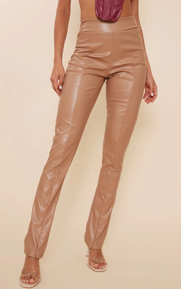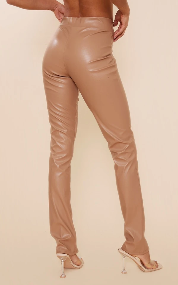 Pantalon en similicuir gris pierre fendu taille haute à détail coutures