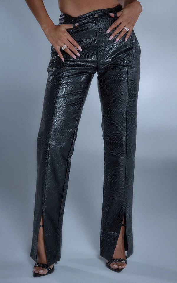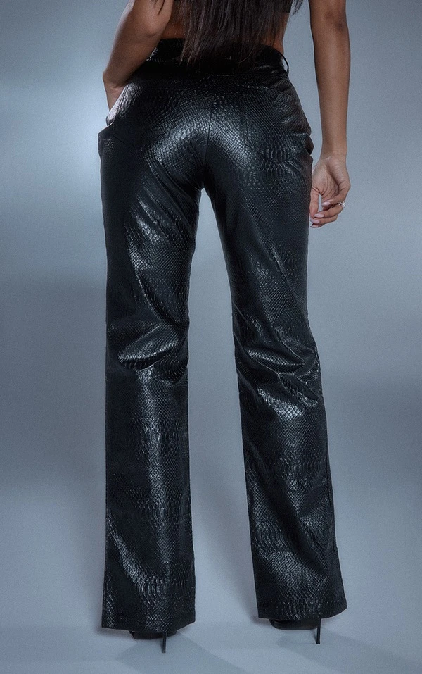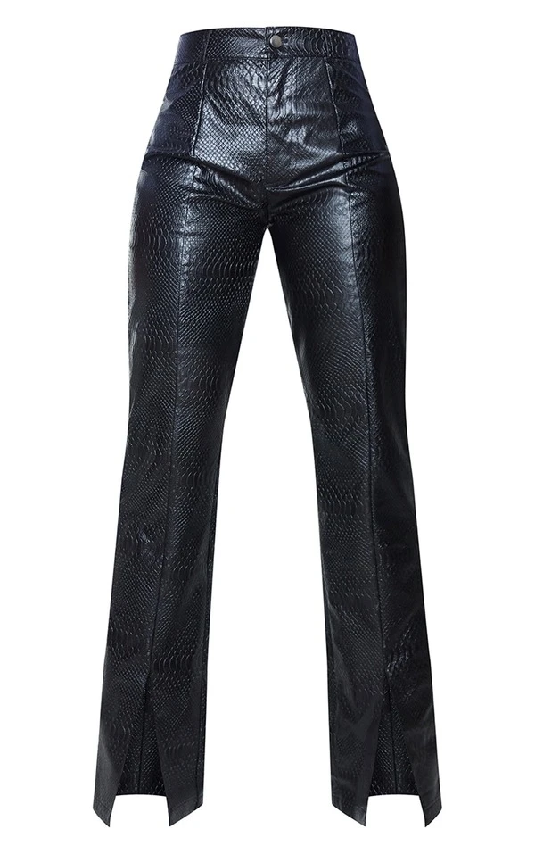 Culte le pantalon en similicuir noir! Avec son effet croco et ses ourlets fendus, il est parfait pour donner une touche rock Ă vos looks du moment. Impossible de s’en passer!