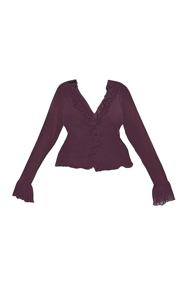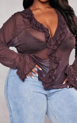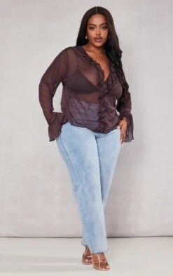On crush à fond sur cette blouse ! Avec sa matière en mesh, sa couleur chocolat délicieuse et son détail volanté hyper stylé, cette pièce est tout un mood. On aime la porter avec un petit jean bleu délavé et des talons hauts. Un look qui sera reposté sur les réseaux !