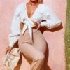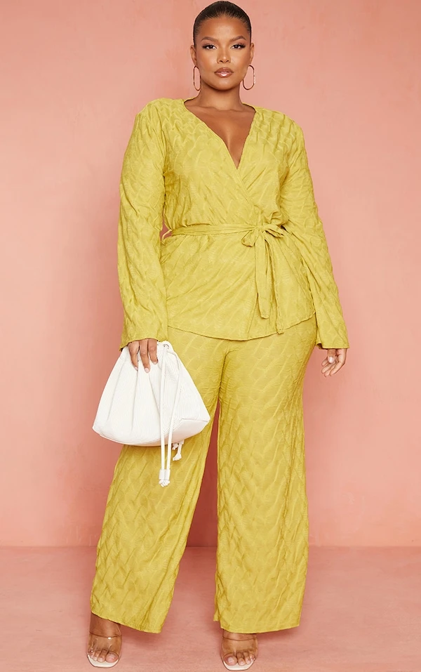 De toute beauté dans ce chemisier cache-coeur de couleur chartreuse. Avec sa matière texturée et son design noué sur le devant, on aime le porter avec le pantalon de la même couleur. Il ne manque qu’une paire de mules et quelques accessoires, ni plus ni moins !