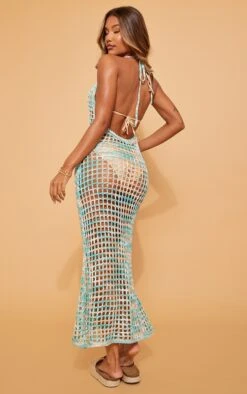 Robe de plage longue crème en maille tricot côtelée déchirée